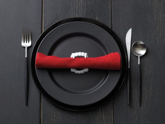Con unas cuantas dentaduras de plástico a modo de servilletero podéis preparar una mesa sencilla y espeluznante. Por si acaso, colocad también alguna ristra de ajos, que nunca se sabe.