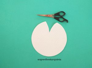 Para hacer la hoja del nenúfar dibujamos con el compás en un papel o cartulina, un círculo del que cortaremos una porción como en la imagen (algo así como dibujar un pacman). Esta será nuestra plantilla para recortar la hoja en goma EVA de color verde.